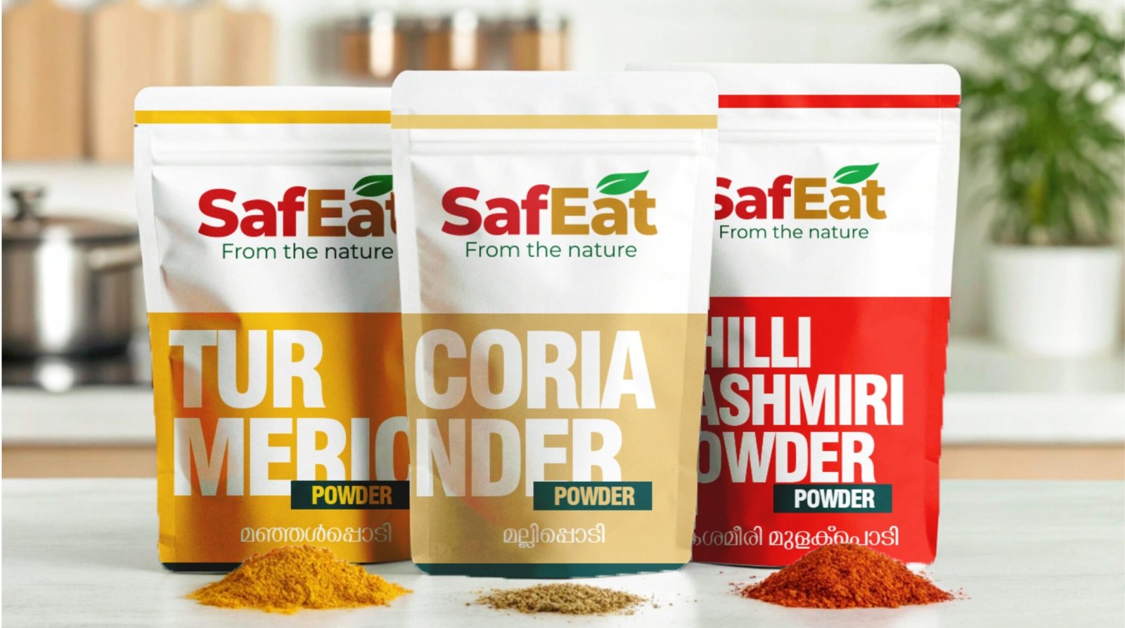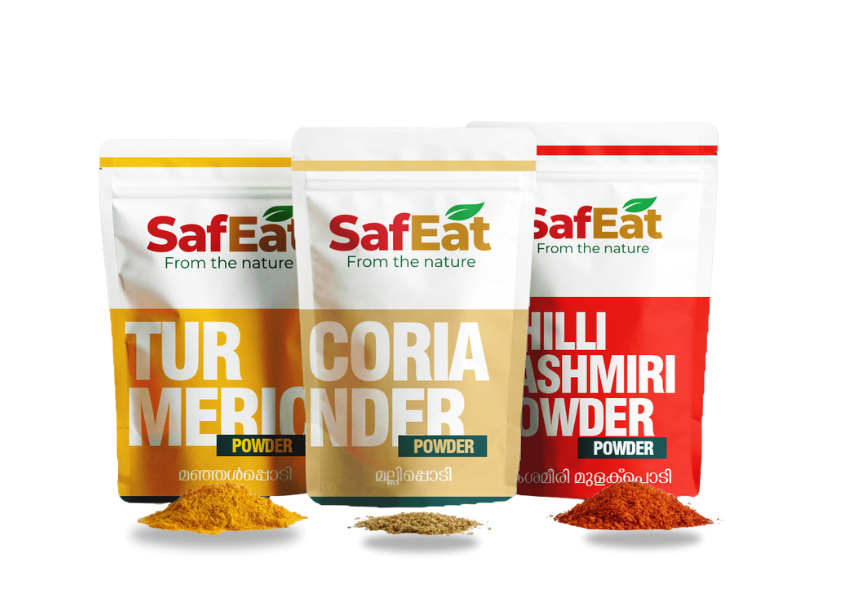 SafEat spices are sourced from specific regions known for their natural potency — Wayanad turmeric, Tellicherry black pepper, Idukki forest ginger, and Vattavada chillies. We don’t mix anonymous bulk produce. Every spice carries a story of its origin.